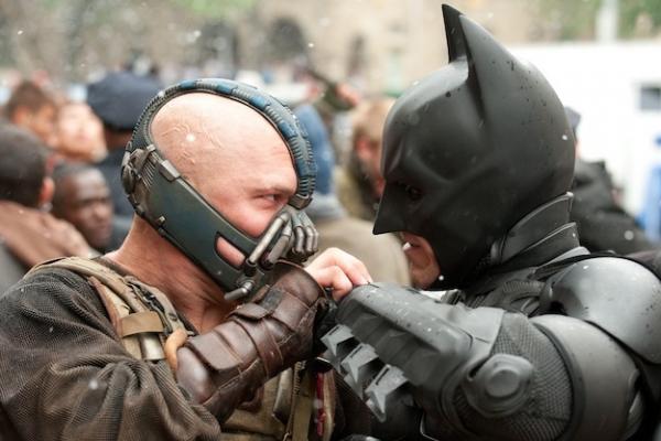 Bane (Tom Hardy, right) battles Batman (Christian Bale) in the concluding installment of Christopher Nolan’s Dark Knight trilogy.