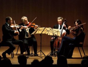 (l-r) Mark Ivanir, Philip Seymour Hoffman, Christopher Walken, and Catherine Keener strive for harmony in ‘A Late Quartet’.